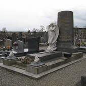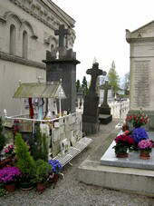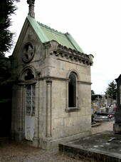 | Une galerie de personnages illustresSi Rousseau, Jarry ou Tatin ne s’y trouvent pas enterrés, le cimetière de Vaufleury réserve cependant au visiteur de passage quelques rencontres privilégiées avec de célèbres artistes lavallois. Parmi ces derniers, on notera plus particulièrement la présence du peintre Jean-Baptiste Messager, témoin des bouleversements urbains que connut Laval au XIXème siècle, et du maître-verrier Alleaume, dont le curieux tombeau est orné d’un petit menhir prompt à rappeler ses origines bretonnes. L’art naïf est également à l’honneur avec des personnalités comme Andrée Bordeaux-Le Pecq, galeriste et mécène qui participa activement à la création du musée, ou Jean-Pierre Bouvet, premier conservateur de cet établissement, qui dressa les plans de sa dernière demeure comme une œuvre d’art originale couverte de tesselles colorées.D’autres grandes personnalités s’y côtoient également comme les historiens Couanier de Launay, auteur d’une histoire de Laval publiée en 1866, ou Félix Grat, membre de l’école française de Rome mort au champ d’honneur en 1940. Au milieu de ces grands noms, il est cependant surprenant de constater que la tombe la plus visitée du cimetière est sans doute celle d’un obscur jésuite décédé en 1833 . Ayant laissé le souvenir d’un saint homme, le père Coince est aujourd’hui toujours vénéré et son intercession sollicitée à l’égard des petits enfants souffrant de maux divers. A lui seul, ce tombeau témoigne de la déférence des vivants à l’égard des morts et de la survivance de leur souvenir en ce jardin du repos éternel que demeure le cimetière Vaufleury. |
