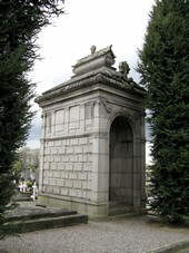 | Vaufleury, chef d’œuvre de Ridel L’architecte Léopold Ridel, auteur d’autres grands projets urbains lavallois comme le musée des Beaux Arts, le jardin de la Perrine ou la chapelle Saint-Julien, se voit confié la réalisation des aménagements du cimetière Vaufleury. Il va composer le plan de celui-ci sur le modèle régulier d’une ville antique. L’entrée principale sur la route de Paris se présente sous la forme d’une grande avenue rectiligne bordée de séquoias. L’emploi de ces résineux, capables de vivre jusqu’à 1.000 ans, est à percevoir comme une référence symbolique à l’éternité. Cette dernière est également clairement évoquée dans l’œuvre de l’architecte par les torchères sculptées du portail ou le décor de rameaux qui orne les pavillons destinés à recevoir le logement du gardien et l’administration du cimetière. A l’intérieur de l’enceinte séparant la nouvelle nécropole du monde des vivants, Ridel trace deux grandes avenues perpendiculaires, elles mêmes coupées par des allées plus petites, divisant ainsi l’espace en huit carrés de même surface. Au cours du XXème siècle, ceux-ci sont peu à peu colonisés par les dernières demeures de nombreux Lavallois. A ce jour, Vaufleury accueille 12.000 sépultures pour 66.000 corps inhumés, dont celui de Léopold Ridel lui même qui trouva le repos en ce lieu après sa mort en 1910. |