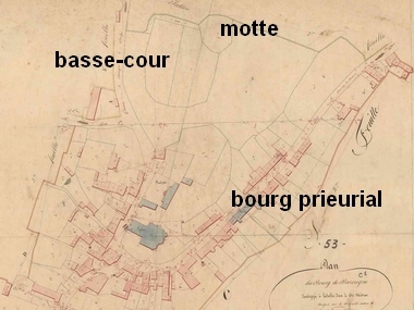 | La motte castrale et le bourg castralUn des rares cas de mention d’un château au 11e siècle : castrum, castellum, ce qui comprend la motte et basse-cour en plus. Celle-ci était certainement allotie : coïncidait-elle avec le bourg ? C’est très possible.Motte tabulaire de 31 m à la base et 18 m au sommet, pour 8,5 m de hauteur. Des dimensions fort respectables !
