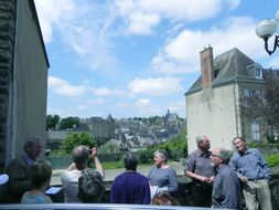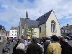 | En quittant la chapelle, le chemin montais passe devant une belle maison du 15e-16e s., qui aurait servi de relais de diligence, pour mener à une source ferrugineuse alimentant le lavoir de la Mère de Dieu.Les traces du chemin montais sont infime entre Grazay et Mayenne et, considérant tout le parcours qui nous attendait, nous nous sommes rendus directement à Saint-Martin de Mayenne, faubourg par lequel le chemin abordait la ville en passant sous une Porte Montaise aujourd’hui disparue. Du parvis de l’église, le panorama sur la ville nous permet d’évoquer la formation de cette dernière à partir de bourgs nés au pied du palais carolingien, construit au début du 10e s. à l’emplacement d’une villa du haut Moyen Âge. Le chemin montais structure cette agglomération qui s’est étendue le long de son parcours, perpendiculairement à la rivière. Aujourd’hui encore, la rue du 130e RI, qui correspond au chemin, est l’axe du centre ancien. Le passage des pèlerins et les craintes qu’ils soulevaient dans la population locale font l’objet d’un arrêt municipal plutôt restrictif de 1668. |
