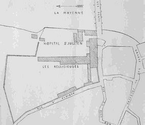A partir de 1206, suite à la donation d’Alard II confirmée par Alard IV, une aumônerie est installée en bordure de la Mayenne en amont du pont puis par la suite les constructions sont toutes entreprises sur l’emplacement actuel. La Maison Dieu ainsi créée se doit : d’assurer le service divin, d’héberger et nourrir 13 pauvres ainsi que la gardienne comptée pour deux, d’assurer l’hospitalité pour les passants voir leur enterrement s’ils viennent à décéder lors de leur séjour, en contre partie, l’Aumônerie conserve la propriété de leur bien.