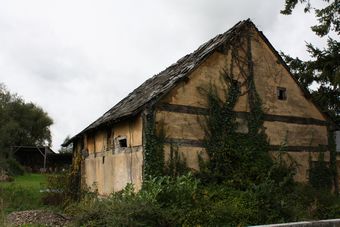 La visite a débuté par les extérieurs d’un bâtiment probablement construit au 18e siècle. Reposant sur un sous-bassement en pierre, il s’agit d’une armature de pièces de bois chevillées dont les intervalles sont garnis de torchis sur lattis. La toiture en ardoise, plus récente, a été gravement endommagée par les coups de vent ; non réparée, son état a contribué à la détérioration générale de l’édifice. Il s’agit d’un exemplaire de construction devenu bien rare et le bilan risque de s’aggraver puisqu’il est condamné à disparaître, vaincu par les parpaings.
