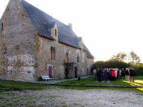 Quelques kilomètres en voiture nous ont emmenés au manoir de la Grande Coudrière. Gervais Barré nous en a détaillé les particularités de sa construction et de sa rénovation, dont la souche de cheminée et la toiture en bardeau (essente) de châtaignier. |