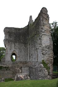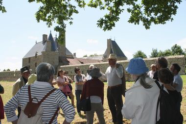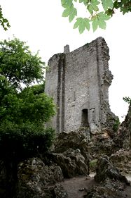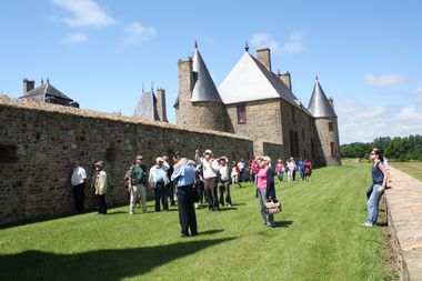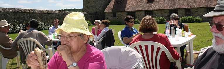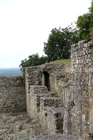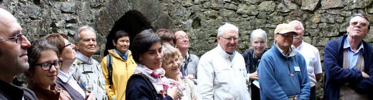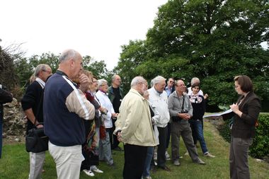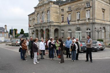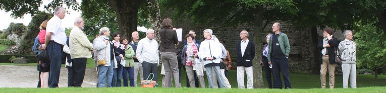 | De 10h à 12h30, nous avons parcouru la ville ancienne en commençant par l’espace du château. La fondation de la ville est due aux seigneurs de Bellême vers 1010. Un château primitif en bois a été élevé notamment pour imposer l’autorité sur cette zone tampon du Passais entre la Normandie et le Maine. C’est une position stratégique sur un éperon rocheux qui domine très abruptement la Varenne. Guillaume le Conquérant le confisque et le Passais annexé à la Normandie. Au 12ème, Domfront passe à Henri 1er Beauclerc, futur roi d’Angleterre qui fortifie cette frontière normande. Il agrandit l’enceinte et fait élever vers 1120 le puissant donjon dont on voit encore aujourd’hui les importants vestiges. On décèle également sur cet espace les fondations d’une aula et les ruines d’une très vaste chapelle.Sur la partie orientale de la douve sèche, une courtine à gaine aménagée dans l’épaisseur des remparts et percée de meurtrières court sur une longueur importante, dans un état de conservation étonnant. Ce château fut démantelé en 1608 sur l’ordre de Henri IV. | ||||||||