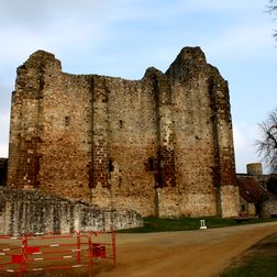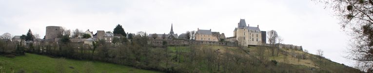 On pense qu’un fort bâtiment en bois préfigurait le château (9e s.). Le donjon de pierres qui lui a succédé remonte sans doute au début du 11e s. Il a connu le siège du château par Guillaume le Conquérant, voulant mâter une révolte des barons du Maine en 1083. Le bâtiment, rectangulaire, comprend trois niveaux. La brèche permettant d’entrer au niveau inférieur est un percement moderne. Au Moyen Âge, on y accédait seulement par un escalier intérieur. C’était un cellier, faiblement éclairé par de petites fenêtres à linteau échancré et gravé de faux claveaux, comme celles des églises romanes.L’entrée du bâtiment se faisait par le premier étage, grâce à un avant-corps disparu qui contenait un escalier. Elle a été modifiée au 15e s. par l’aménagement d’un pont-levis dont la poulie est encore en place. Ce niveau était celui de l’aula, la salle de réception seigneuriale.