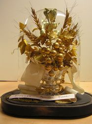 (Pour en savoir plus, rendez-vous sur le site de la revue en ligne : « Ex-voto et globes de mariées dans les chapelles et oratoires de la Mayenne » par Joël Poujade. Ci-dessous en exemple le bouquet de première messe de l’Abbé Angot qui ne se trouve pas dans cette chapelle.)