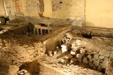 Interamnes, agglomération secondaire en territoire diablinte En 1987, la découverte par J-H. Boufflet de thermes gallo-romains sous l’église Saint-Étienne permet de mettre en valeur le rôle joué dans l’Antiquité par l’agglomération secondaire d’Entrammes située à la confluence de trois rivières (la Mayenne, l’Ouette et la Jouanne) sur la voie Le Mans-Rennes. A proximité d’une palestre, terrain de sport où l’on effectuait des exercices physiques, le bâtiment de bains publics mis au jour adopte la forme d’un quadrilatère de 28,50 mètres de long pour 10 m de large. A l’intérieur, l’espace est cloisonné par des pièces disposées en enfilade à la fonction bien précise. L’usager qui arrivait aux thermes déposait ses vêtements au vestiaire et chaussait des sandales à la semelle de bois pour éviter de se brûler les pieds sur le sol chauffé par un hypocauste. Il traversait rapidement une première salle pour s’installer ensuite au tepidarium ou salle tiède dans laquelle il s’adonnait aux massages et se préparait au bain. Il passait ensuite dans l’étuve (sudatorium) pour y suer abondamment. Enfin, à l’extrémité du bâtiment près du foyer (praefurnium), il gagnait la salle des bains chauds (caldarium) où il pouvait s’immerger dans un bassin à dalles de schiste ou s’asperger au labrum, vasque comprise dans l’épaisseur du mur. Son parcours s’achèvait par un retour à la salle froide (frigidarium) pour une dernière immersion destinée à resserrer les pores de la peau. Monument dédié à l’hygiène, les thermes d’Entrammes, de par la richesse de leur décor fait d’enduits peints et de chapiteaux sculptés en marbre, témoignent également de l’adoption du mode de vie à la romaine des élites gauloises à la fin du 1er et au début du 2ème siècle de notre ère. |