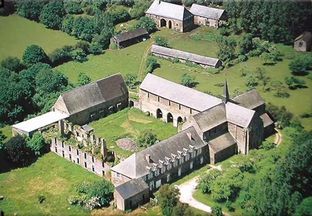 | Fig. 2 Vue aérienne de l’abbaye de Clairmont. Cette vue permet de bien observer ce qui fait de l’abbaye de Clairmont une structure au plan typiquement bernardin. (Crédits : site de l’Association des Amis de l’Abbaye de Clermont) |
