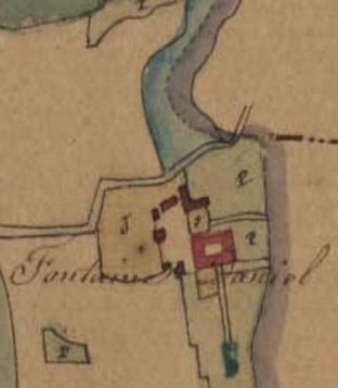 | Fig. 6 Extrait du cadastre dit Napoléonien de la commune de St Georges Buttavent. L’intérêt est de montrer qu’à la veille du développement industriel du village de Fontaine-Daniel, l’abbaye est toujours à l’écart du monde séculier. (Crédits : Arch. Départementales de la Mayenne) |