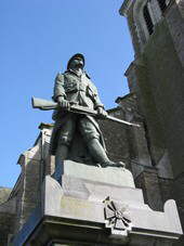 Le monument aux morts de la commune d’Alexain est particulièrement caractéristique des monuments élevés au lendemain de la première guerre. Par son emplacement au cœur du village, entre l’église et la route principale, il rappelle quotidiennement aux vivants le sacrifice des enfants de la commune morts pour la France. Par le motif du poilu, il illustre l’engagement des soldats au centre des combats et se retrouve donc naturellement au cœur des commémorations. Le poilu d’Alexain, œuvre du sculpteur Charles Henri Pourquet, figure parmi les modèles les plus diffusés dans les communes françaises. Intitulé « Résistance », il peut être lu au premier degré comme un remarquable témoignage de l’équipement du soldat français de la guerre 1914-1918 (cartouchière, musette, fusil…). Cependant, la ressemblance s’arrête ici. Les deux jambes écartées tenant son fusil des deux mains face à un ennemi invisible, l’attitude sent la pose. Nous ne sommes pas donc devant une image réaliste du poilu mais bien devant une illustration du célèbre « on ne passe pas ».