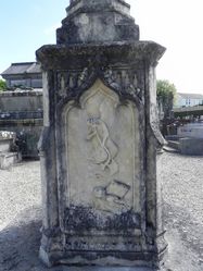 Les chapelles funéraires recèlent aussi parfois de petites œuvres d’art qui ne retiennent pas toujours l’attention des propriétaires et des communes. Cimetière de Bais.