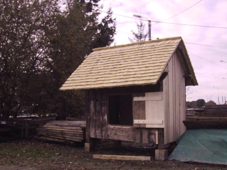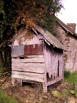 Un « loget » est une structure mobile qui, autrefois, servait de logement aux domestiques dans les exploitations agricoles. Celui-ci, dans les environs d’Ernée, a été restauré il y a quelques années par l’auteur des photos. Divers matériaux pouvaient être employés, bardeau, ardoise, tuile, torchis sur lattis, etc..