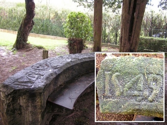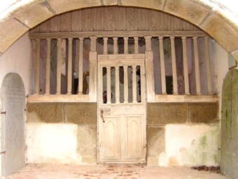 Le cintre reliant les deux piliers de l’entrée du cimetière porte entre-autre la date de 1549, le nom de « CHARDON » qui pourrait être celui du donateur du terrain et la représentation d’un outil de tanneur.