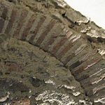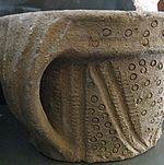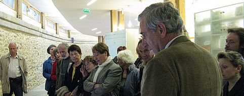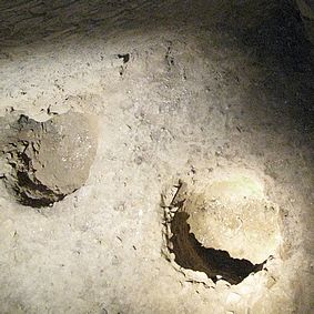 La visite se termine au pied de la façade du bâtiment, dans une crypte archéologique aménagée dans le sol de la cour. Cela permet de voir la base de la tourelle d’escalier ainsi que les terrasses qui bordaient le monument, dont la fonction était sans doute de servir de soubassements à des portiques au niveau de l’aula.