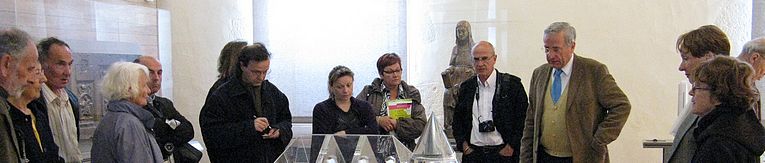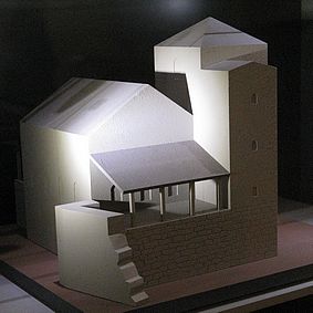 Visite du monument et du muséeLes deux principales salles de musée ont été installées dans l’agrandissement de 1826 pour ne pas encombrer les espaces carolingiens. C’est par le musée que l’on entre : la première salle est consacrée à 1000 ans d’histoire de Mayenne et présente en particulier les objets trouvés lors des fouilles du château. En même temps, une grande maquette interactive permet de comprendre la structure et l’évolution du bâtiment, dont le visiteur découvre la partie carolingienne sous la forme d’un haut mur en gros appareil de granite, constituant la face d’une tour. Ces blocs ont été arrachés à la forteresse de Jublains et témoignent de la continuité que les Carolingiens ont voulu affirmer entre l’ancienne capitale gallo-romaine et le nouveau lieu de pouvoir : Mayenne, c’est Jublains transporté au bord de la rivière.Puis, après avoir aperçu les trous de poteaux illustrant la phase antérieure à la construction de pierre, on pénètre dans l’aula, la salle de réception du palais. Cet espace de prestige était éclairé par de nombreuses fenêtres logées sous des arcades de briques. Un dispositif d’éclairages animés accompagnant un commentaire permet de suivre l’évolution complexe des architectures.