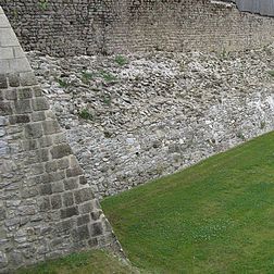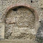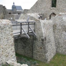La cour elle-même est fermée par un rempart créé dès l’époque carolingienne. On voit encore l’entrée du 10e siècle, couverte par un arc en briques. L’accès actuel se fait par une tour-porte fortifiée du 13e siècle, contemporaine de la création de la vaste basse cour, occupée aujourd’hui par un parc, par laquelle on quitte le château. |