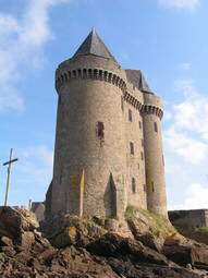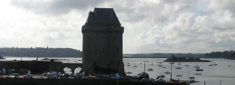Edifiée à l’entrée de l’estuaire de la Rance entre 1362 et 1369 par Etienne Le Ture à la demande du duc Jean IV de Bretagne, la tour Solidor domine l’ancien port militaire de Saint-Servan. Construite en réaction du passage de la cité malouine dans le giron du roi de France, elle adopte la forme d’un puissant donjon dont les assises sont celles d’une ancienne fortification gallo-romaine. Si elle fût remaniée plus tard sur les ordres de Vauban, elle conserve néanmoins les caractères communs à l’architecture militaire de la seconde moitié du 14ème siècle avec ses trois tours réunies par de petites courtines s’élevant à même hauteur. De par ce caractère défensif prononcé, la tour Solidor servit ensuite de prison avant de devenir un musée consacré à l’aventure des cap-horniers.