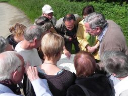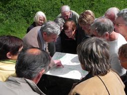 Puis notre groupe s’est rendu à l’Hôtellerie, qui nous a offert l’occasion d’observer la relation entre une voie antique et le chemin médiéval. La rencontre de ces deux routes a déterminé un conflit d’orientations dans le bâti du hameau. Le chemin montais emprunte la voie romaine sur une courte distance, juste ce qu’il faut pour traverser l’Aron, puis la quitte pour rencontrer d’autres segments de voiries anciennes, dans un secteur agricole constamment occupé depuis l’Antiquité. |