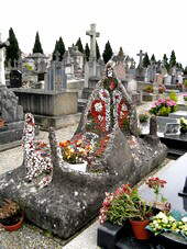 | Une galerie de personnages illustresSi Rousseau, Jarry ou Tatin ne s’y trouvent pas enterrés, le cimetière de Vaufleury réserve cependant au visiteur de passage quelques rencontres privilégiées avec de célèbres artistes lavallois. Parmi ces derniers, on notera plus particulièrement la présence du peintre Jean-Baptiste Messager, témoin des bouleversements urbains que connut Laval au XIXème siècle, et du maître-verrier Alleaume, dont le curieux tombeau est orné d’un petit menhir prompt à rappeler ses origines bretonnes. L’art naïf est également à l’honneur avec des personnalités comme Andrée Bordeaux-Le Pecq, galeriste et mécène qui participa activement à la création du musée, ou Jean-Pierre Bouvet, premier conservateur de cet établissement, qui dressa les plans de sa dernière demeure comme une œuvre d’art originale couverte de tesselles colorées.D’autres grandes personnalités s’y côtoient également comme les historiens Couanier de Launay, auteur d’une histoire de Laval publiée en 1866, ou Félix Grat, membre de l’école française de Rome mort au champ d’honneur en 1940. Au milieu de ces grands noms, il est cependant surprenant de constater que la tombe la plus visitée du cimetière est sans doute celle d’un obscur jésuite décédé en 1833 . Ayant laissé le souvenir d’un saint homme, le père Coince est aujourd’hui toujours vénéré et son intercession sollicitée à l’égard des petits enfants souffrant de maux divers. A lui seul, ce tombeau témoigne de la déférence des vivants à l’égard des morts et de la survivance de leur souvenir en ce jardin du repos éternel que demeure le cimetière Vaufleury. |