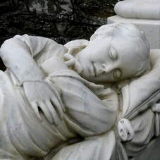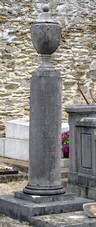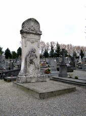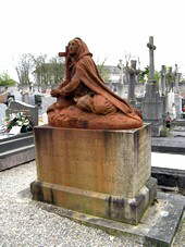 | Un musée d’art funéraireSi les monuments érigés à des dates récentes répondent bien souvent à des modèles stéréotypés, il n’en est pas de même pour les tombeaux plus anciens qui témoignent de la vitalité de l’art funéraire au XIXème siècle. Ainsi est-il possible de découvrir dans les allées de Vaufleury nombre de petits chefs d’œuvre représentatifs de ce courant dynamique. De la stèle sculptée à l’image d’une pleureuse comme celle de Léopold Ridel, en passant par le sarcophage ou les colonnes ornées d’urnes cinéraires* de la famille Souchu-Servinière, quelques monuments adoptent un style propre à rappeler des références antiques. En parallèle, se développe également un mouvement historicisant caractérisé par l’élévation de chapelles funéraires inspirées des cathédrales du moyen-âge. Certaines reçoivent un décor élaboré de motifs historiés ou de chapiteaux sculptés dignes de pouvoir figurer dans n’importe quelle édifice roman ou gothique. Les gisants sont par contre totalement absents du site, à l’exception du remarquable tombeau du petit Paul-Marie Batard, représenté en sommeil sous la forme d’une émouvante statue de marbre blanc. |
