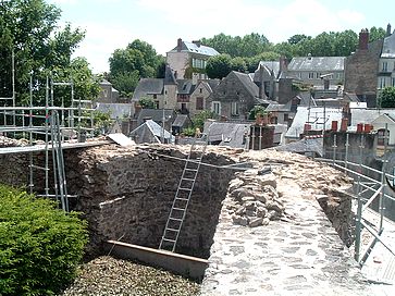 La période romane (11ème-12ème siècle)Fondé vers 1020 par Guy de Dénéré, apparenté à la puissante famille de Château-du-Loir, le castrum de Laval vient prendre le contrôle d’un gué sur la Mayenne situé sur le tracé de la voie antique Le Mans-Corseul. Les études parcellaires conduites par Dominique Eraud puis Jean-Michel Gousset ont permis de mettre en évidence un château primitif à basse cour importante s’articulant entre les sites actuels du château, de la cathédrale de la Trinité et de Saint-Tugal. Le dispositif défensif de l’ensemble était alors vraisemblablement verrouillé par trois mottes dont la plus importante protégeait l’accès de la forteresse à l’ouest. La première résidence seigneuriale ou domicilium, repérée par Jacques Naveau lors des fouilles de la cour du château actuel, se développe par la suite à la fin du 11ème ou au début du 12ème siècle par l’adjonction d’un bâtiment à l’aplomb de la rivière. Ce dernier devient le siège, après 1160, d’une chapelle desservie par les chanoines de la collégiale Sainte-Marie du château de Laval.
