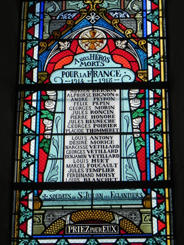Les 8 vitraux, réalisés en 1920 par Auguste Alleaume sur le thème de la guerre de 14-18 ont été restaurés et replacés dans la nef. Déposés en 1998, stockés depuis, ils renaissent grâce à l’action de l’association locale « Sauvegarde et Mémoire de l’église de Saint-Julien-des-Églantiers ».